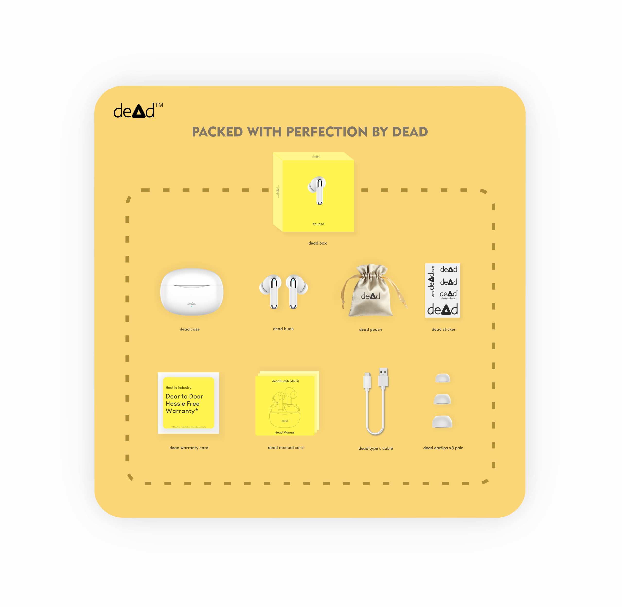 1 × dead Carry Pouch, 1 × dead Manual, 1 × dead Type C Cable, 1 × dead stickers, 1 × dead warranty card, 2 sizes of silicone budsA eartips, dead budsA(white)